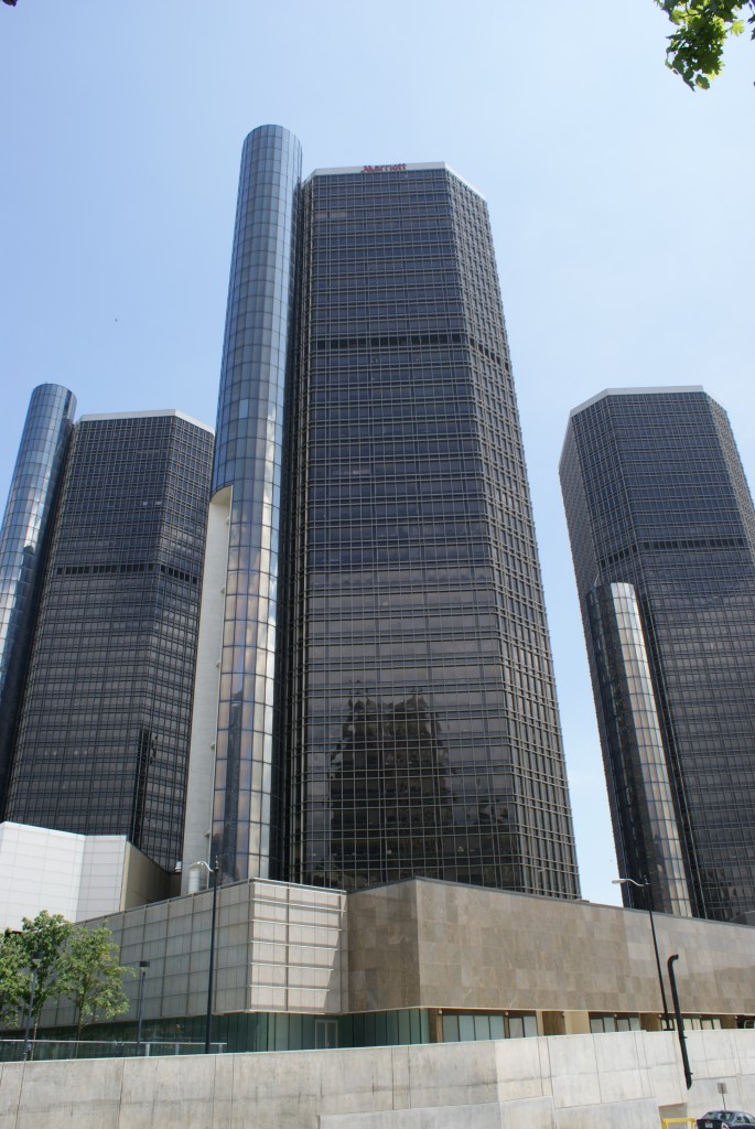 RenCen is a group of connected glass skyscrapers. The central and highest tower is Detroit Marriott which has 73 floors. Wintergarden, the complex’s structural glass entry lobby, offers expansive views of the Windsor skyline. The modern complex includes offices, a hotel, shops, restaurants and the GM World exhibit inside the Renaissance Center.