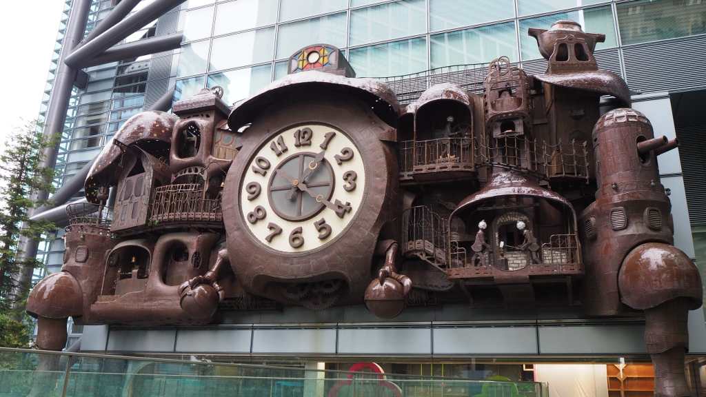 The massive Ghibli Clock is located in front of the Nittele Tower (the headquarters of Nippon Television). It was created by Hayao Miyazaki, the well-known director and co-founder of Japanese animation Studio Ghibli.
